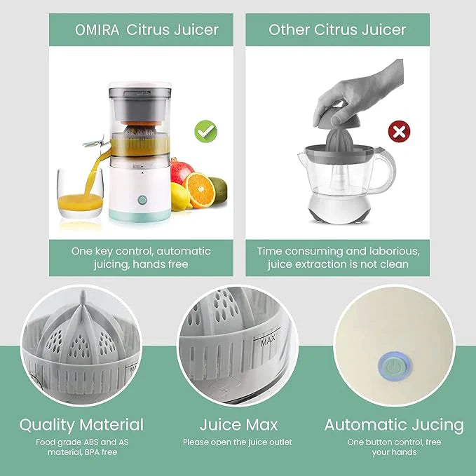 - π PORTABLE MIGHTY JUICER, GETS EVERY LAST DROP, EVERY TIME:Β The OMIRA Juice Vortex is the Ultimate Portable Juicer that can be carried anywhere in your bag for any outdoor adventure! This USB-C Rechargeable Electric Citrus Juicer is powerful enough to last numerous juicing sessions. The one-size fits all design works with oranges, apples, pears, grapes, lemons, watermelon, and even pomegranates.